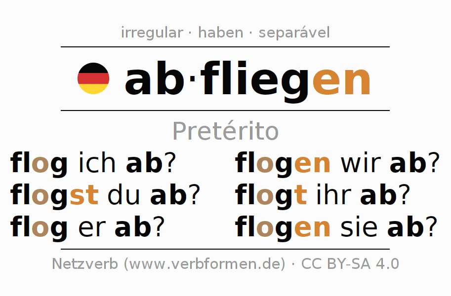 A conjugação do verbo abfliegen no Ativo Pretérito Indicativo Pretérito é: flog ich ab?, flogst du ab?, flog er ab?, flogen wir ab?, flogt ihr ab?, flogen sie ab?.A formação dessas formas segue determinadas regras gramaticais. Os requisitos para a conjugação do verbo como forma verbal simples no abfliegen do Pretérito. Comentários ☆