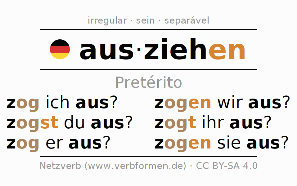 A conjugação do verbo ausziehen no Ativo Pretérito Indicativo Pretérito é: zog ich aus?, zogst du aus?, zog er aus?, zogen wir aus?, zogt ihr aus?, zogen sie aus?.A formação dessas formas segue determinadas regras gramaticais. Os requisitos para a conjugação do verbo como forma verbal simples no ausziehen do Pretérito. Comentários ☆