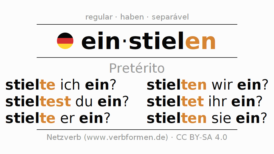 A conjugação do verbo einstielen no Ativo Pretérito Indicativo Pretérito é: stielte ich ein?, stieltest du ein?, stielte er ein?, stielten wir ein?, stieltet ihr ein?, stielten sie ein?.A formação dessas formas segue determinadas regras gramaticais. Os requisitos para a conjugação do verbo como forma verbal simples no einstielen do Pretérito. Comentários ☆