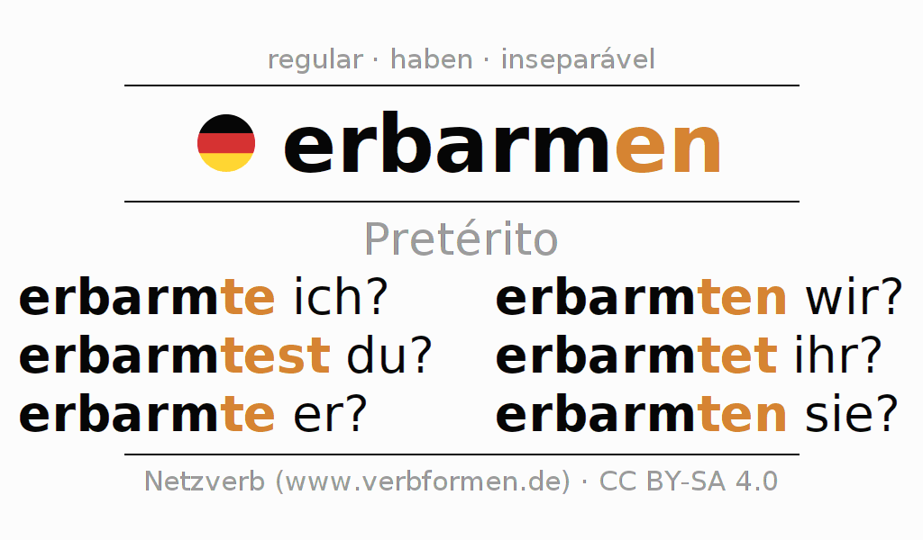 A conjugação do verbo erbarmen no Ativo Pretérito Indicativo Pretérito é: erbarmte ich?, erbarmtest du?, erbarmte er?, erbarmten wir?, erbarmtet ihr?, erbarmten sie?.A formação dessas formas segue determinadas regras gramaticais. Os requisitos para a conjugação do verbo como forma verbal simples no erbarmen do Pretérito. Comentários ☆