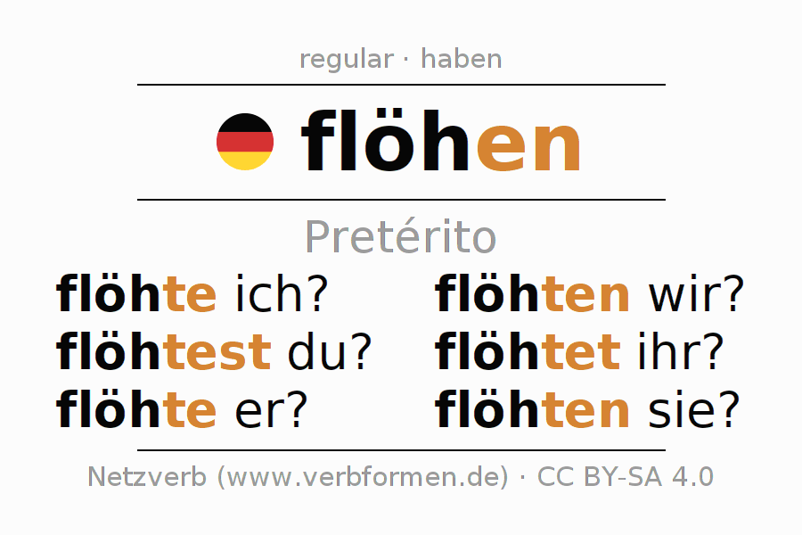 A conjugação do verbo flöhen no Ativo Pretérito Indicativo Pretérito é: flöhte ich?, flöhtest du?, flöhte er?, flöhten wir?, flöhtet ihr?, flöhten sie?.A formação dessas formas segue determinadas regras gramaticais. Os requisitos para a conjugação do verbo como forma verbal simples no flöhen do Pretérito. Comentários ☆