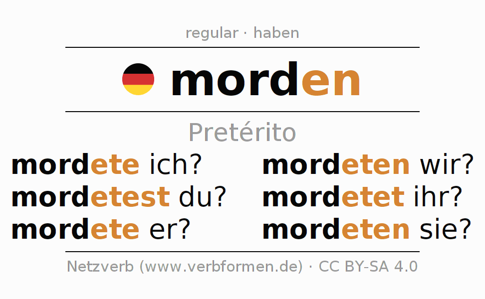 A conjugação do verbo morden no Ativo Pretérito Indicativo Pretérito é: mordete ich?, mordetest du?, mordete er?, mordeten wir?, mordetet ihr?, mordeten sie?.A formação dessas formas segue determinadas regras gramaticais. Os requisitos para a conjugação do verbo como forma verbal simples no morden do Pretérito. Comentários ☆