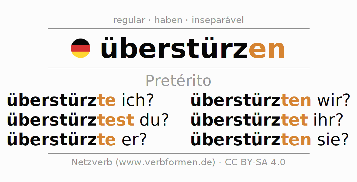 A conjugação do verbo überstürzen no Ativo Pretérito Indicativo Pretérito é: überstürzte ich?, überstürztest du?, überstürzte er?, überstürzten wir?, überstürztet ihr?, überstürzten sie?.A formação dessas formas segue determinadas regras gramaticais. Os requisitos para a conjugação do verbo como forma verbal simples no überstürzen do Pretérito. Comentários ☆