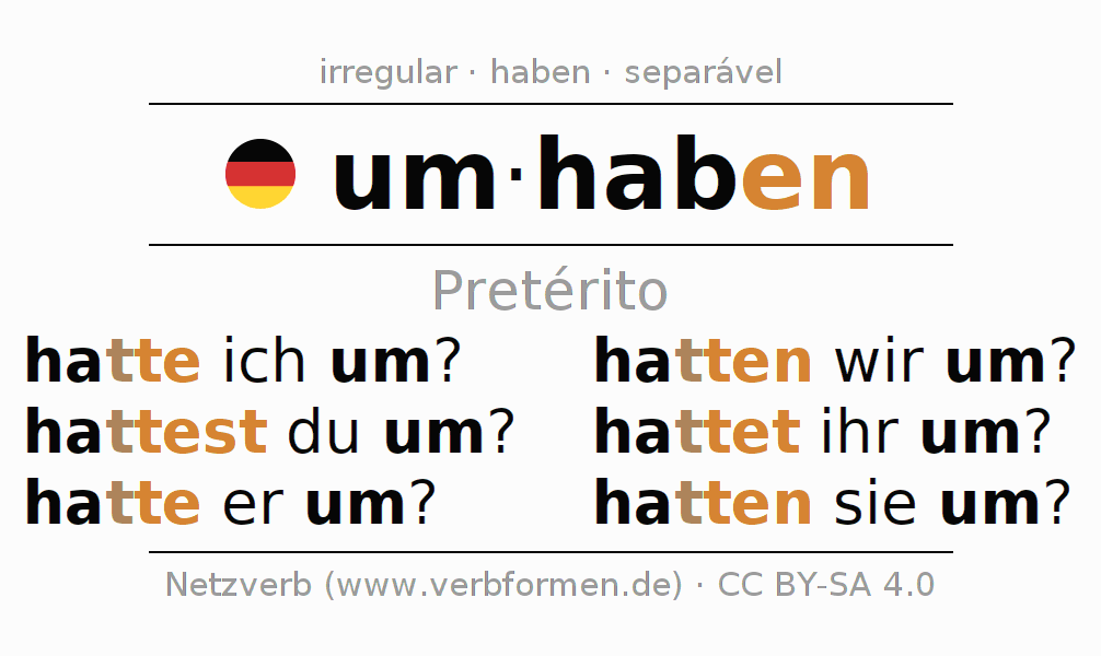 A conjugação do verbo umhaben no Ativo Pretérito Indicativo Pretérito é: hatte ich um?, hattest du um?, hatte er um?, hatten wir um?, hattet ihr um?, hatten sie um?.A formação dessas formas segue determinadas regras gramaticais. Os requisitos para a conjugação do verbo como forma verbal simples no umhaben do Pretérito. Comentários ☆