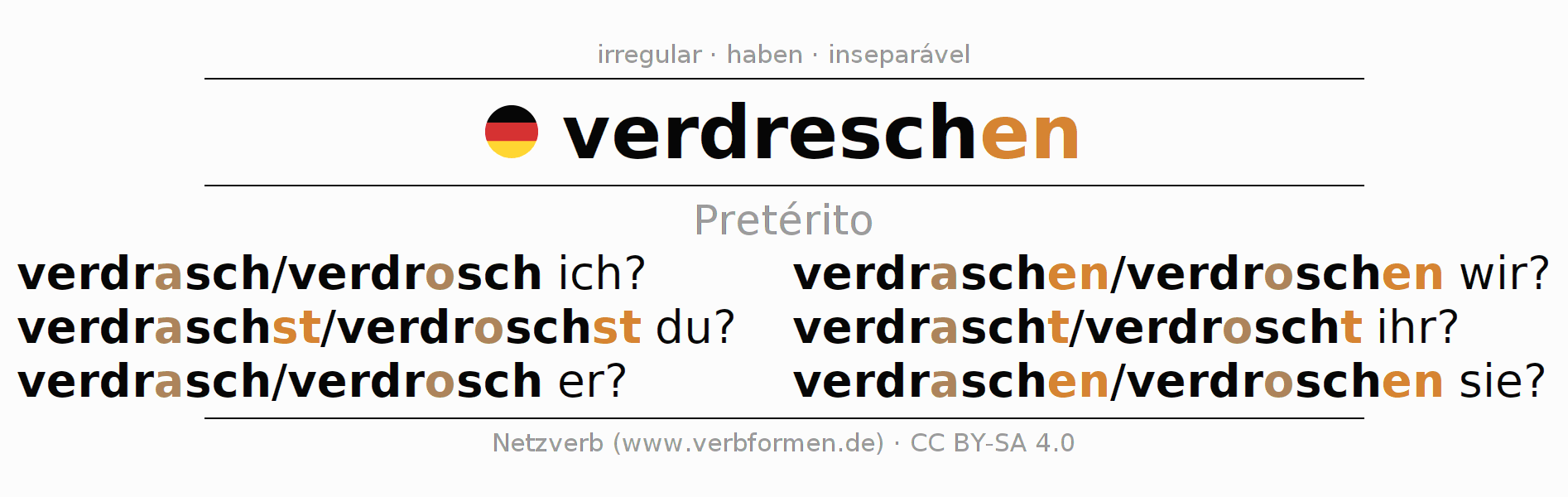 A conjugação do verbo verdreschen no Ativo Pretérito Indicativo Pretérito é: verdrasch/verdrosch ich?, verdraschst/verdroschst du?, verdrasch/verdrosch er?, verdraschen/verdroschen wir?, verdrascht/verdroscht ihr?, verdraschen/verdroschen sie?.A formação dessas formas segue determinadas regras gramaticais. Os requisitos para a conjugação do verbo como forma verbal simples no verdreschen do Pretérito. Comentários ☆
