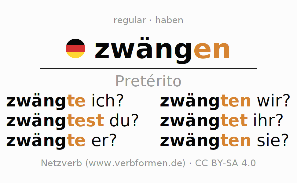 A conjugação do verbo zwängen no Ativo Pretérito Indicativo Pretérito é: zwängte ich?, zwängtest du?, zwängte er?, zwängten wir?, zwängtet ihr?, zwängten sie?.A formação dessas formas segue determinadas regras gramaticais. Os requisitos para a conjugação do verbo como forma verbal simples no zwängen do Pretérito. Comentários ☆