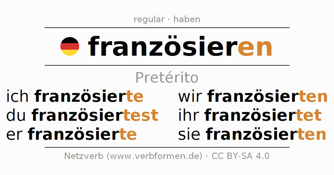 As formas de conjugação do verbo französieren (francesar, francesizar) no pretérito são: ich französierte, du französiertest, er französierte, wir französierten, ihr französiertet, sie französierten