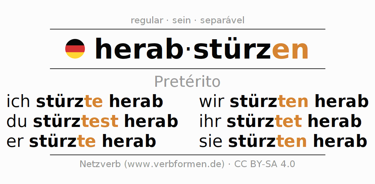 As formas de conjugação do verbo herabstürzen (cair, descer) no pretérito são: ich stürzte herab, du stürztest herab, er stürzte herab, wir stürzten herab, ihr stürztet herab, sie stürzten herab