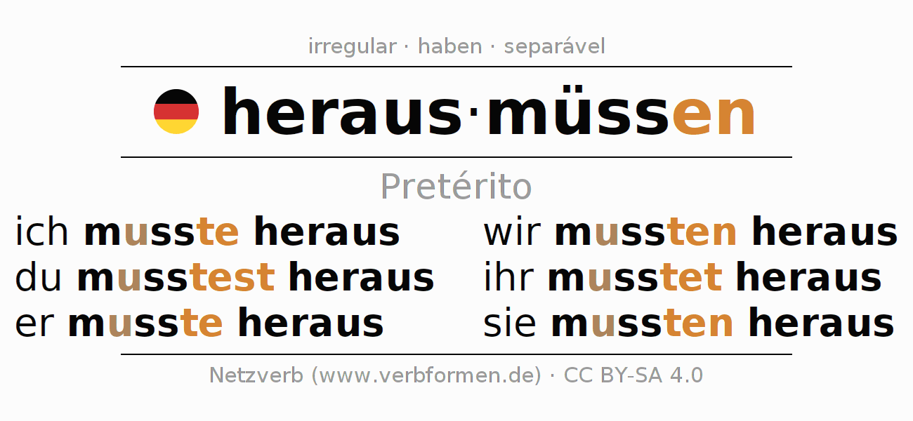 As formas de conjugação do verbo herausmüssen (precisar levantar, ter que sair) no pretérito são: ich musste heraus, du musstest heraus, er musste heraus, wir mussten heraus, ihr musstet heraus, sie mussten heraus