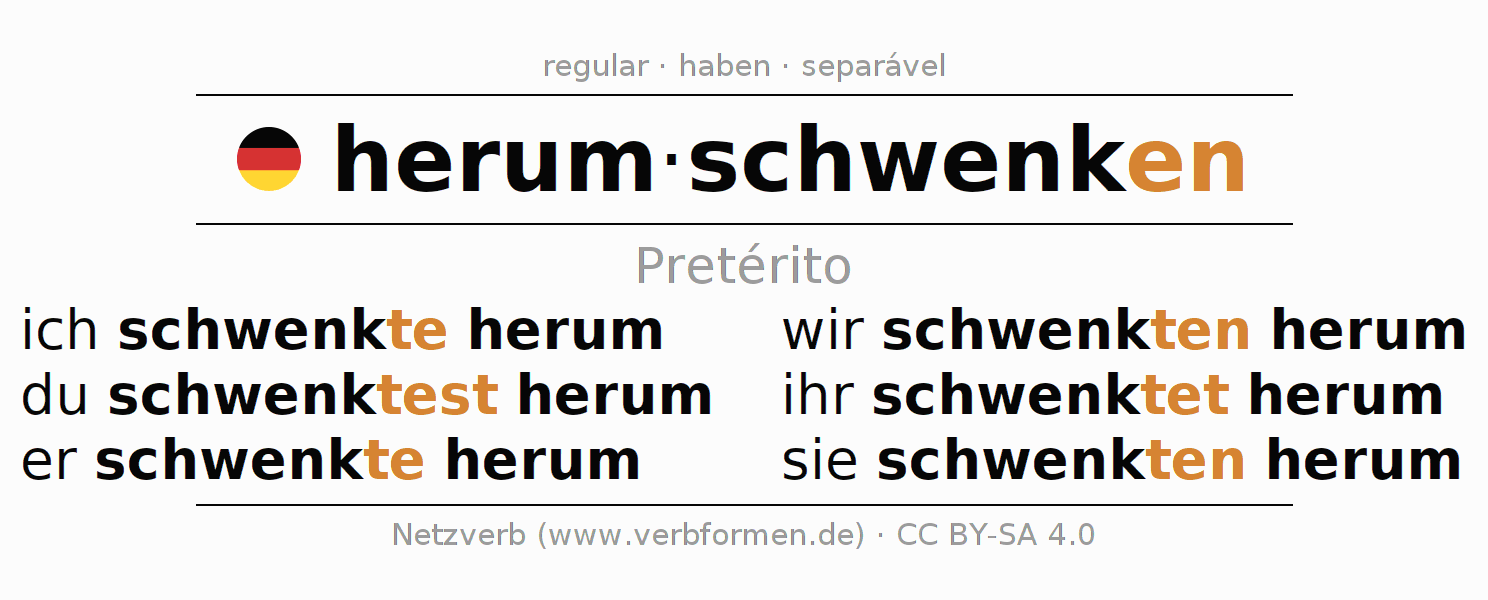 As formas de conjugação do verbo herumschwenken (agitar, balançar) no pretérito são: ich schwenkte herum, du schwenktest herum, er schwenkte herum, wir schwenkten herum, ihr schwenktet herum, sie schwenkten herum