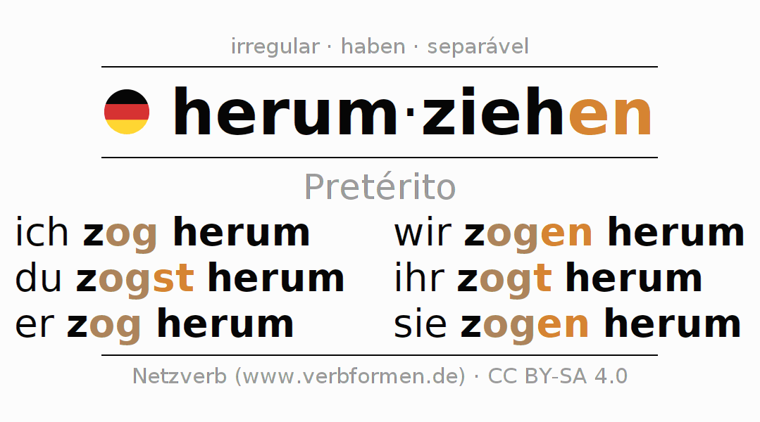 As formas de conjugação do verbo herumziehen (circular, cercar) no pretérito são: ich zog herum, du zogst herum, er zog herum, wir zogen herum, ihr zogt herum, sie zogen herum