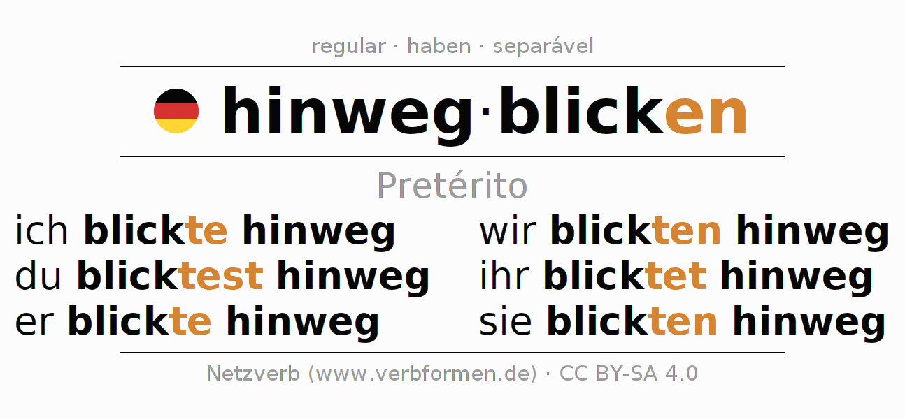 As formas de conjugação do verbo hinwegblicken (descontar, desconsiderar) no pretérito são: ich blickte hinweg, du blicktest hinweg, er blickte hinweg, wir blickten hinweg, ihr blicktet hinweg, sie blickten hinweg