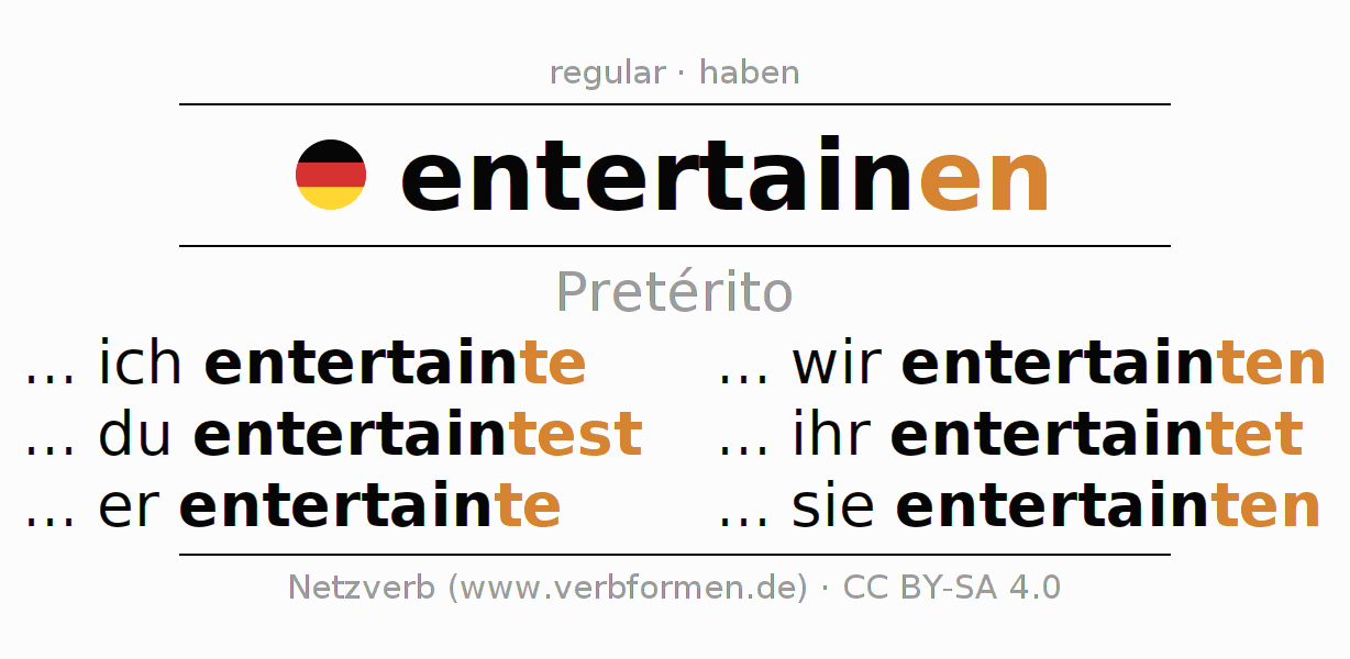 A conjugação do verbo entertainen no Ativo Pretérito Indicativo Pretérito é: ... ich entertainte, ... du entertaintest, ... er entertainte, ... wir entertainten, ... ihr entertaintet, ... sie entertainten.A formação dessas formas segue determinadas regras gramaticais. Os requisitos para a conjugação do verbo como forma verbal simples no entertainen do Pretérito. Comentários ☆