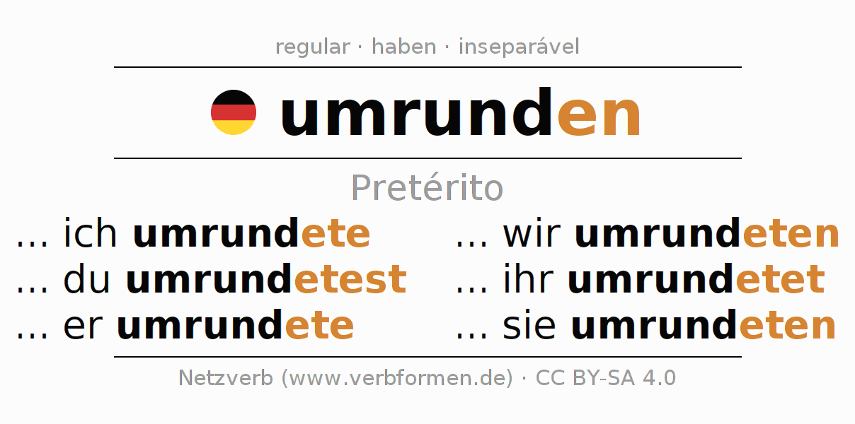 A conjugação do verbo umrunden no Ativo Pretérito Indicativo Pretérito é: ... ich umrundete, ... du umrundetest, ... er umrundete, ... wir umrundeten, ... ihr umrundetet, ... sie umrundeten.A formação dessas formas segue determinadas regras gramaticais. Os requisitos para a conjugação do verbo como forma verbal simples no umrunden do Pretérito. Comentários ☆