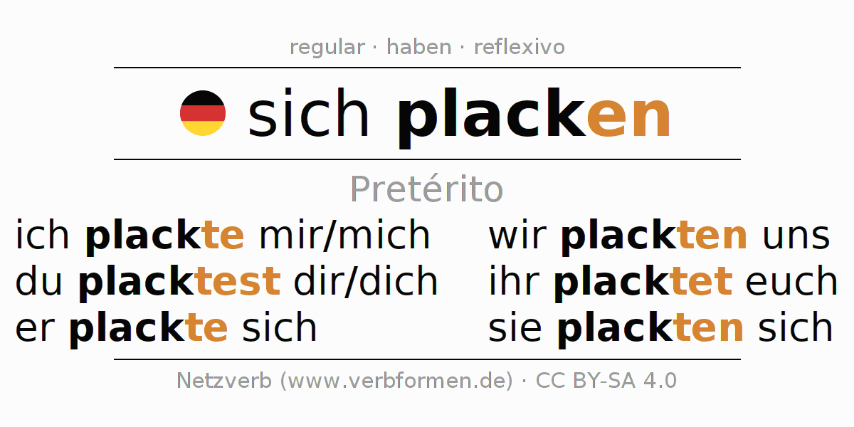 As formas de conjugação do verbo sich placken (esgotar, trabalhar arduamente) no pretérito são: ich plackte mir/mich, du placktest dir/dich, er plackte sich, wir plackten uns, ihr placktet euch, sie plackten sich