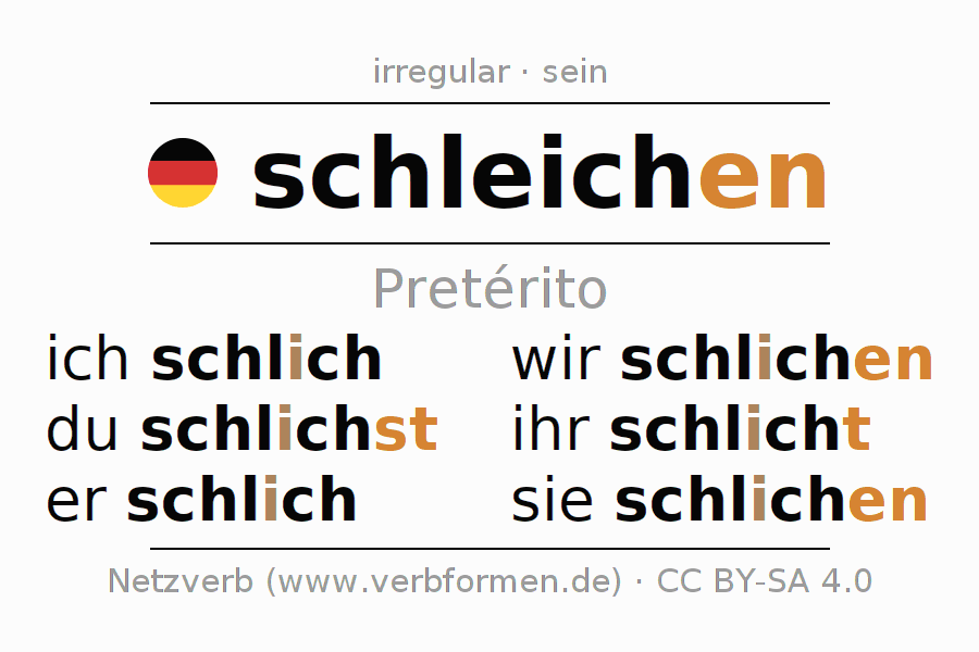 As formas de conjugação do verbo schleichen (esgueirar, andar de mansinho) no pretérito são: ich schlich, du schlichst, er schlich, wir schlichen, ihr schlicht, sie schlichen