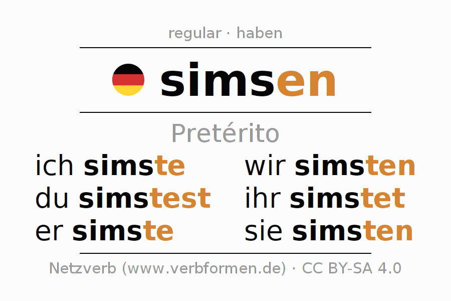 As formas de conjugação do verbo simsen (mandar SMS, enviar SMS) no pretérito são: ich simste, du simstest, er simste, wir simsten, ihr simstet, sie simsten