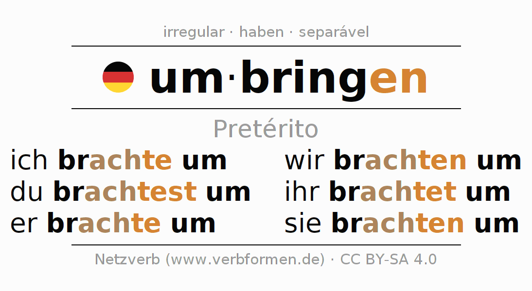 As formas de conjugação do verbo umbringen (matar, assassinar) no pretérito são: ich brachte um, du brachtest um, er brachte um, wir brachten um, ihr brachtet um, sie brachten um