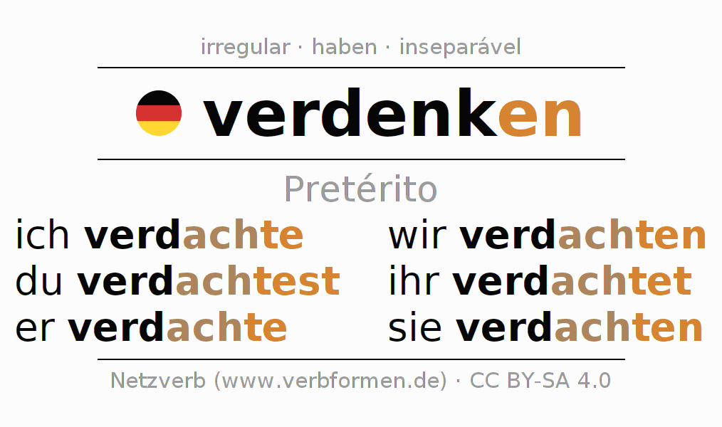 As formas de conjugação do verbo verdenken (guardar rancor, levar a mal) no pretérito são: ich verdachte, du verdachtest, er verdachte, wir verdachten, ihr verdachtet, sie verdachten