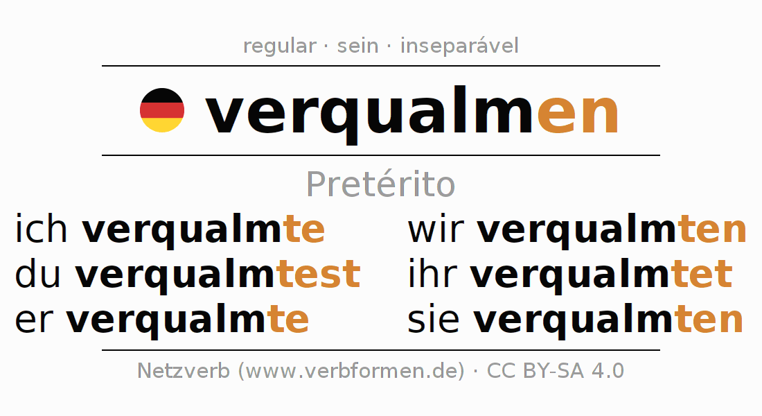 As formas de conjugação do verbo verqualmen (dissipar) no pretérito são: ich verqualmte, du verqualmtest, er verqualmte, wir verqualmten, ihr verqualmtet, sie verqualmten