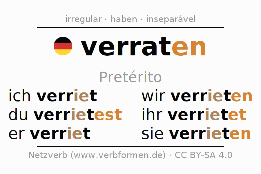 As formas de conjugação do verbo verraten (revelar, trair) no pretérito são: ich verriet, du verriet(e)st, er verriet, wir verrieten, ihr verrietet, sie verrieten