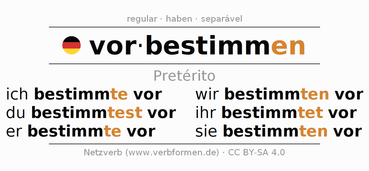As formas de conjugação do verbo vorbestimmen (definir antecipadamente, predestinar) no pretérito são: ich bestimmte vor, du bestimmtest vor, er bestimmte vor, wir bestimmten vor, ihr bestimmtet vor, sie bestimmten vor