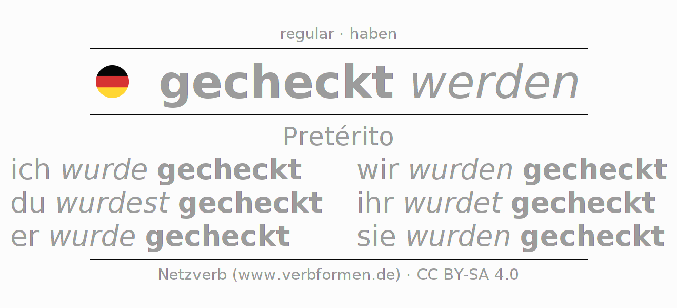A conjugação do verbo checken no Voz Passiva Pretérito Indicativo Pretérito é: ich wurde gecheckt, du wurdest gecheckt, er wurde gecheckt, wir wurden gecheckt, ihr wurdet gecheckt, sie wurden gecheckt.A formação dessas formas segue determinadas regras gramaticais. Os requisitos para a conjugação do verbo como forma verbal simples no checken do Pretérito. Comentários ☆