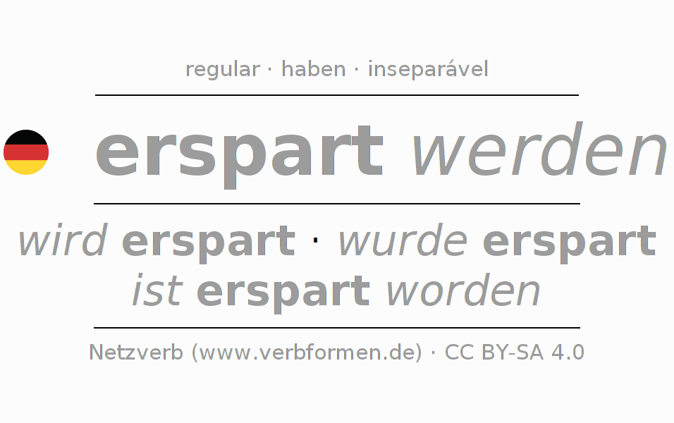 A conjugação do verbo ersparen no Voz Passiva Pretérito Indicativo Pretérito é: ich wurde erspart, du wurdest erspart, er wurde erspart, wir wurden erspart, ihr wurdet erspart, sie wurden erspart.A formação dessas formas segue determinadas regras gramaticais. Os requisitos para a conjugação do verbo como forma verbal simples no ersparen do Pretérito. Comentários ☆