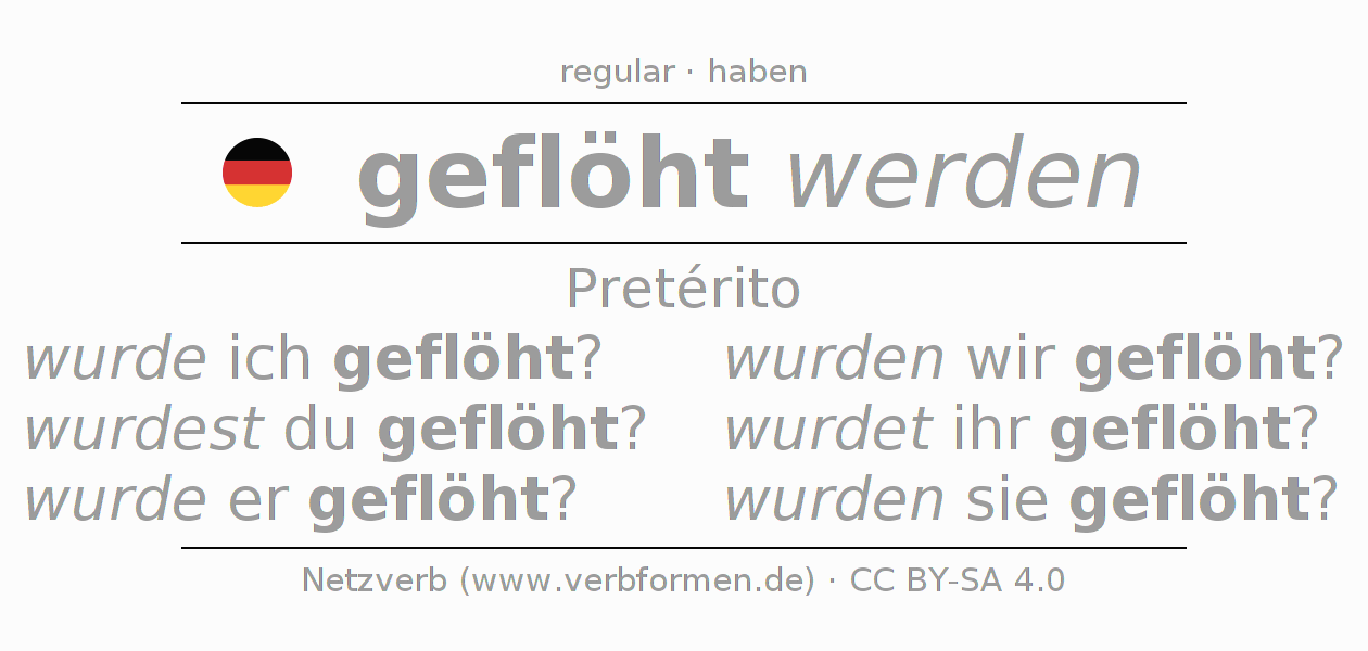 A conjugação do verbo flöhen no Voz Passiva Pretérito Indicativo Pretérito é: wurde ich geflöht?, wurdest du geflöht?, wurde er geflöht?, wurden wir geflöht?, wurdet ihr geflöht?, wurden sie geflöht?.A formação dessas formas segue determinadas regras gramaticais. Os requisitos para a conjugação do verbo como forma verbal simples no flöhen do Pretérito. Comentários ☆