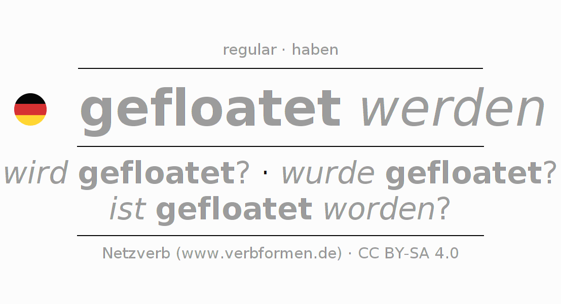 A conjugação do verbo floaten no Voz Passiva Pretérito Indicativo Pretérito é: wurde ich gefloatet?, wurdest du gefloatet?, wurde er gefloatet?, wurden wir gefloatet?, wurdet ihr gefloatet?, wurden sie gefloatet?.A formação dessas formas segue determinadas regras gramaticais. Os requisitos para a conjugação do verbo como forma verbal simples no floaten do Pretérito. Comentários ☆