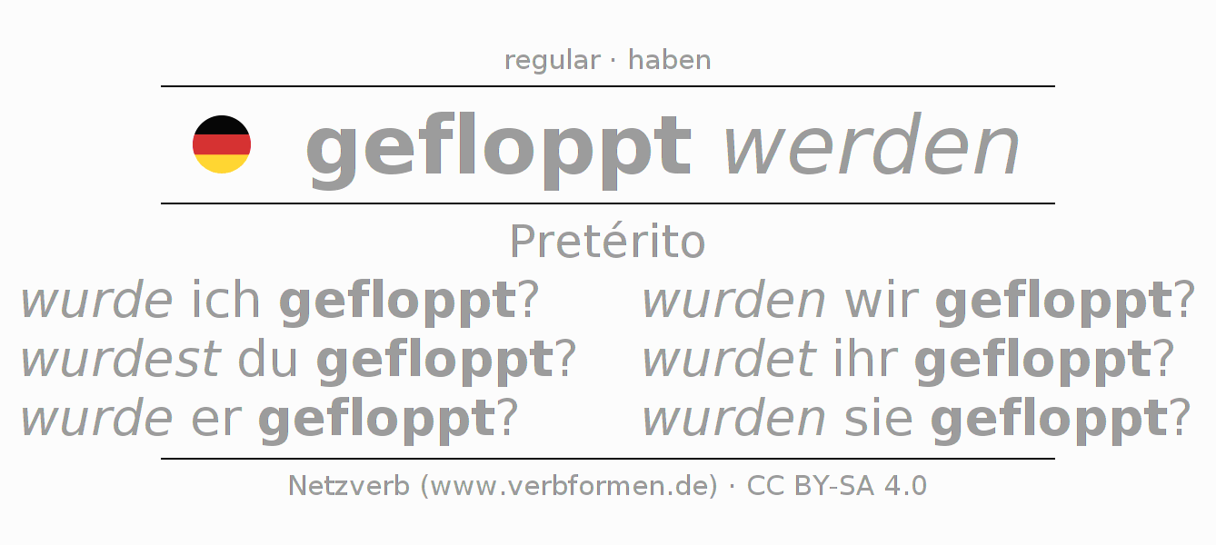 A conjugação do verbo floppen no Voz Passiva Pretérito Indicativo Pretérito é: wurde ich gefloppt?, wurdest du gefloppt?, wurde er gefloppt?, wurden wir gefloppt?, wurdet ihr gefloppt?, wurden sie gefloppt?.A formação dessas formas segue determinadas regras gramaticais. Os requisitos para a conjugação do verbo como forma verbal simples no floppen do Pretérito. Comentários ☆