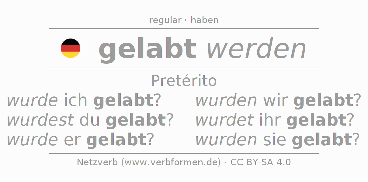 A conjugação do verbo laben no Voz Passiva Pretérito Indicativo Pretérito é: wurde ich gelabt?, wurdest du gelabt?, wurde er gelabt?, wurden wir gelabt?, wurdet ihr gelabt?, wurden sie gelabt?.A formação dessas formas segue determinadas regras gramaticais. Os requisitos para a conjugação do verbo como forma verbal simples no laben do Pretérito. Comentários ☆