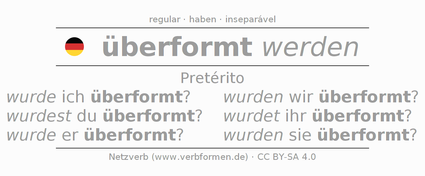 A conjugação do verbo überformen no Voz Passiva Pretérito Indicativo Pretérito é: wurde ich überformt?, wurdest du überformt?, wurde er überformt?, wurden wir überformt?, wurdet ihr überformt?, wurden sie überformt?.A formação dessas formas segue determinadas regras gramaticais. Os requisitos para a conjugação do verbo como forma verbal simples no überformen do Pretérito. Comentários ☆