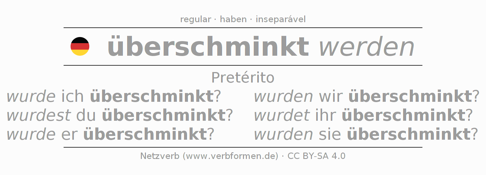 A conjugação do verbo überschminken no Voz Passiva Pretérito Indicativo Pretérito é: wurde ich überschminkt?, wurdest du überschminkt?, wurde er überschminkt?, wurden wir überschminkt?, wurdet ihr überschminkt?, wurden sie überschminkt?.A formação dessas formas segue determinadas regras gramaticais. Os requisitos para a conjugação do verbo como forma verbal simples no überschminken do Pretérito. Comentários ☆