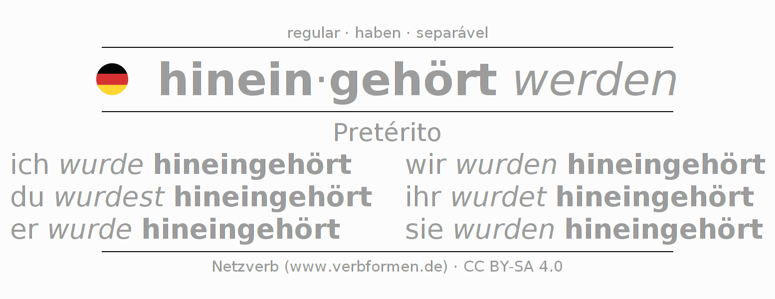 A conjugação do verbo hineingehören no Voz Passiva Pretérito Indicativo Pretérito é: ich wurde hineingehört, du wurdest hineingehört, er wurde hineingehört, wir wurden hineingehört, ihr wurdet hineingehört, sie wurden hineingehört.A formação dessas formas segue determinadas regras gramaticais. Os requisitos para a conjugação do verbo como forma verbal simples no hineingehören do Pretérito. Comentários ☆