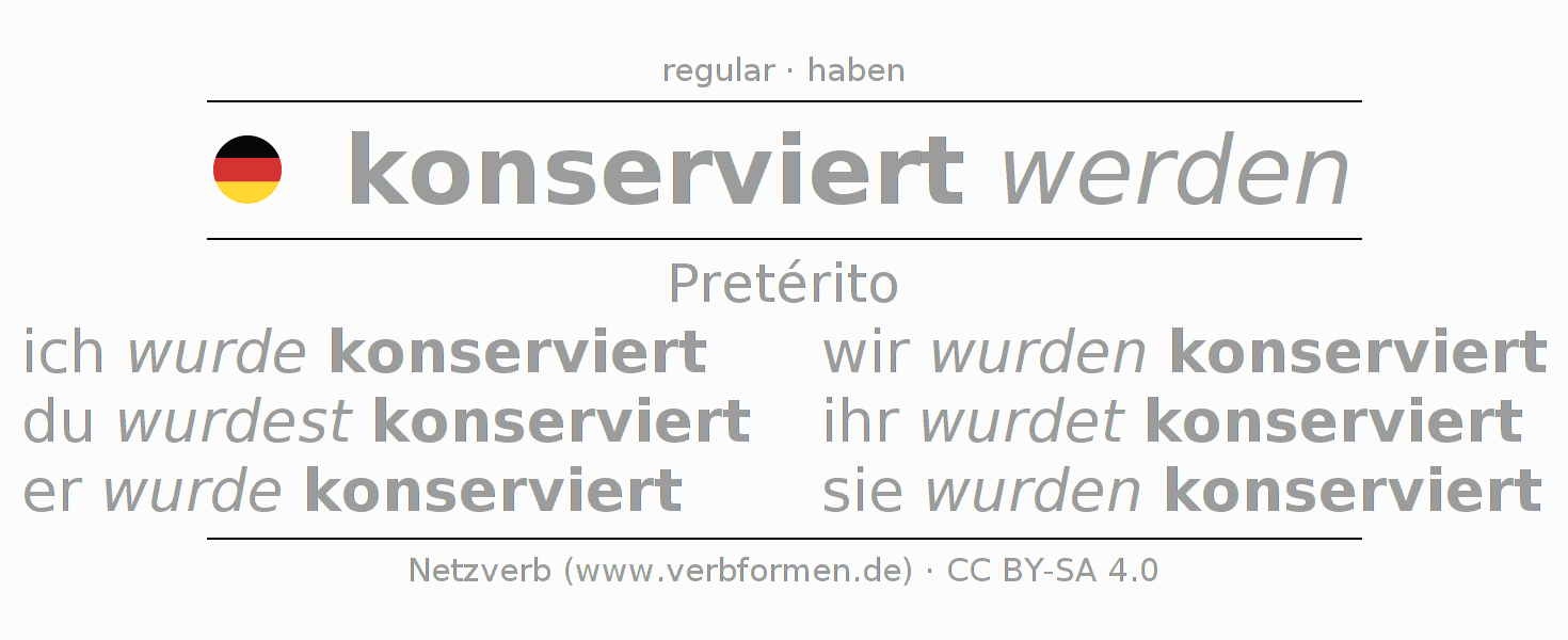 A conjugação do verbo konservieren no Voz Passiva Pretérito Indicativo Pretérito é: ich wurde konserviert, du wurdest konserviert, er wurde konserviert, wir wurden konserviert, ihr wurdet konserviert, sie wurden konserviert.A formação dessas formas segue determinadas regras gramaticais. Os requisitos para a conjugação do verbo como forma verbal simples no konservieren do Pretérito. Comentários ☆