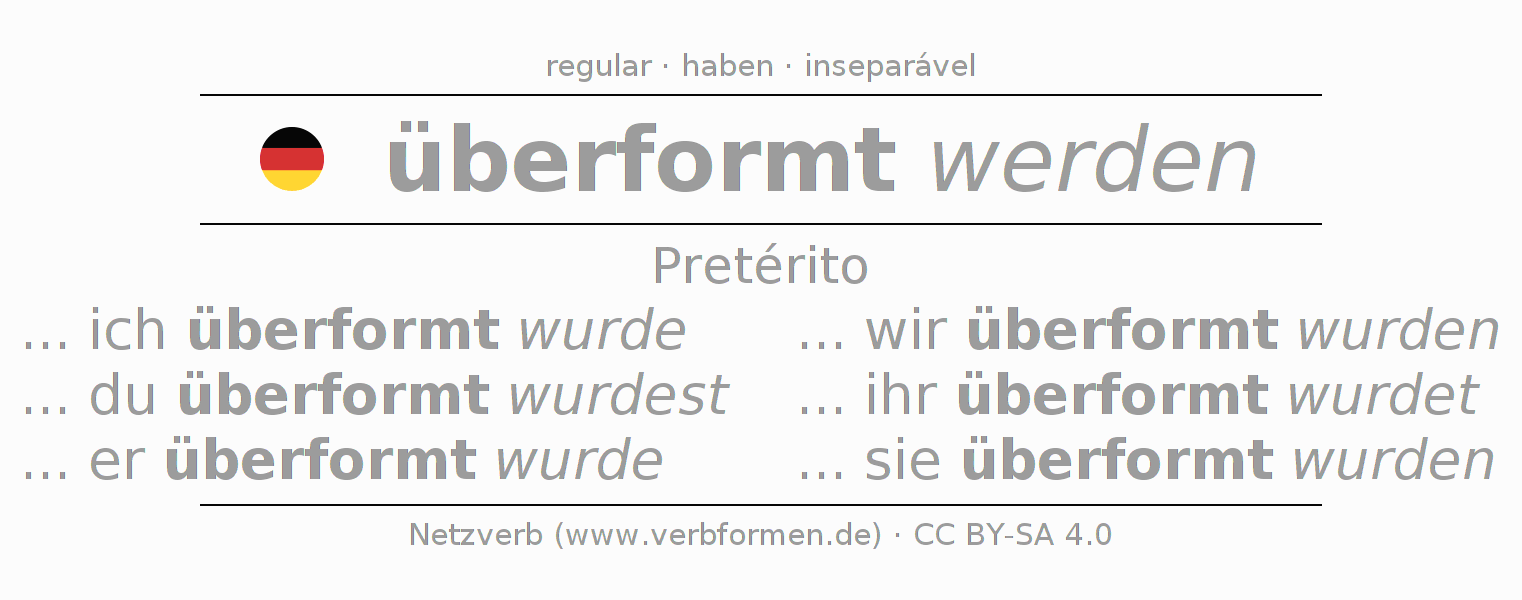 A conjugação do verbo überformen no Voz Passiva Pretérito Indicativo Pretérito é: ... ich überformt wurde, ... du überformt wurdest, ... er überformt wurde, ... wir überformt wurden, ... ihr überformt wurdet, ... sie überformt wurden.A formação dessas formas segue determinadas regras gramaticais. Os requisitos para a conjugação do verbo como forma verbal simples no überformen do Pretérito. Comentários ☆