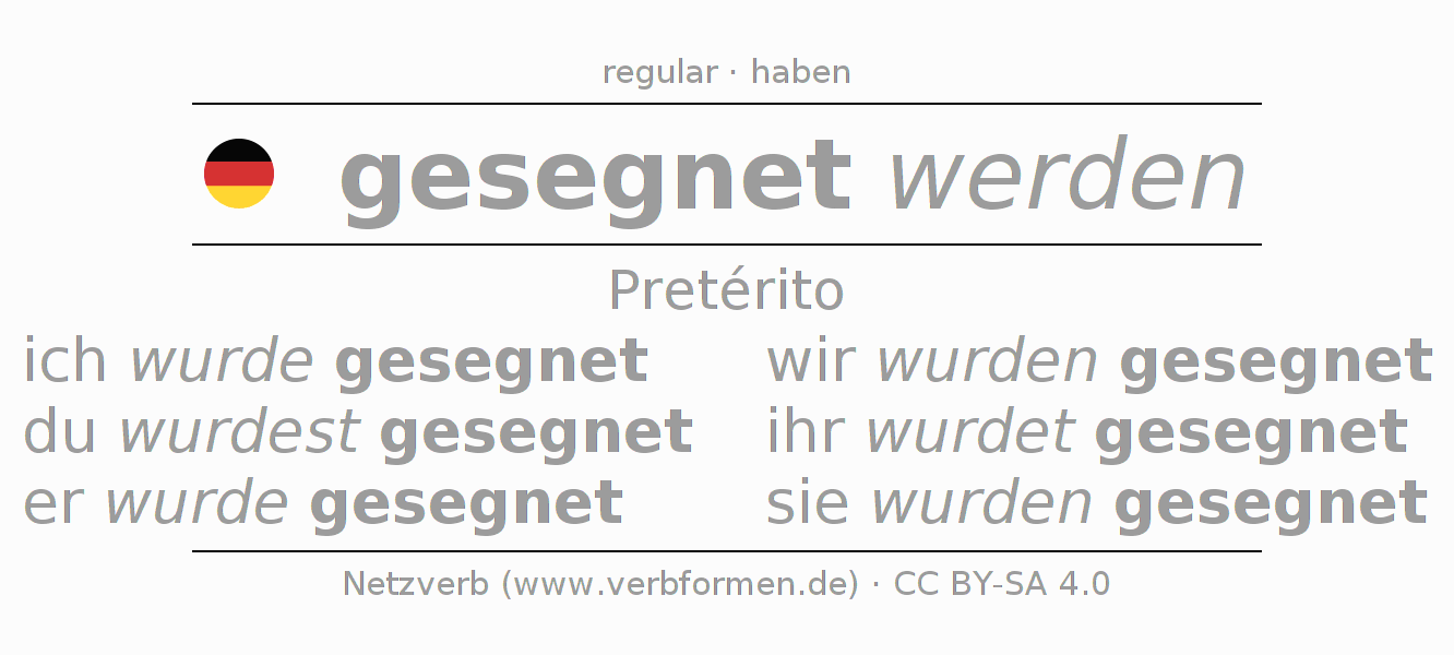 A conjugação do verbo segnen no Voz Passiva Pretérito Indicativo Pretérito é: ich wurde gesegnet, du wurdest gesegnet, er wurde gesegnet, wir wurden gesegnet, ihr wurdet gesegnet, sie wurden gesegnet.A formação dessas formas segue determinadas regras gramaticais. Os requisitos para a conjugação do verbo como forma verbal simples no segnen do Pretérito. Comentários ☆