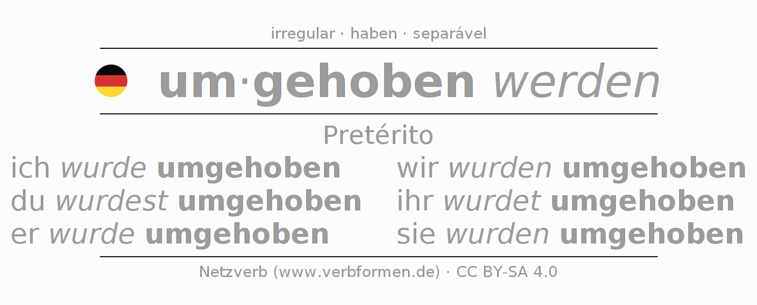 A conjugação do verbo umheben no Voz Passiva Pretérito Indicativo Pretérito é: ich wurde umgehoben, du wurdest umgehoben, er wurde umgehoben, wir wurden umgehoben, ihr wurdet umgehoben, sie wurden umgehoben.A formação dessas formas segue determinadas regras gramaticais. Os requisitos para a conjugação do verbo como forma verbal simples no umheben do Pretérito. Comentários ☆