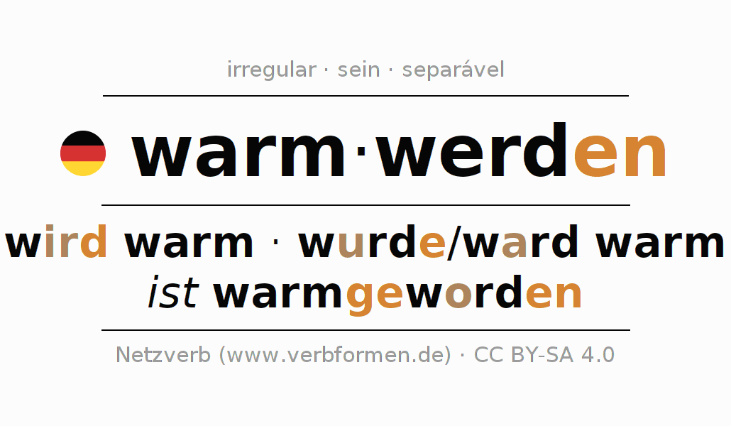 As formas de conjugação do verbo warmwerden (acostumar-se, aprender a apreciar) no pretérito são: ich wurde/ward warm, du wurdest/wardest warm, er wurde/ward warm, wir wurden/warden warm, ihr wurdet/wardet warm, sie wurden/warden warm
