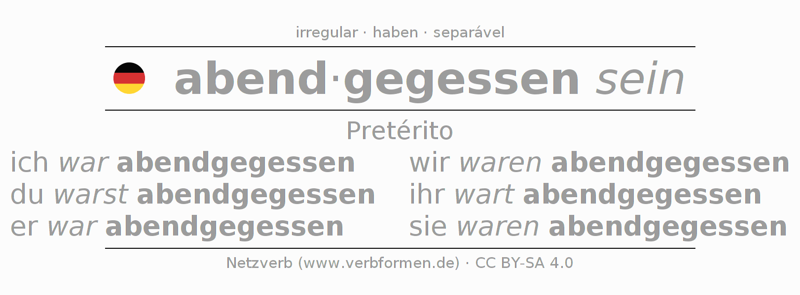 A conjugação do verbo abendessen no Estado passivo Pretérito Indicativo Pretérito é: ich war abendgegessen, du warst abendgegessen, er war abendgegessen, wir waren abendgegessen, ihr wart abendgegessen, sie waren abendgegessen.A formação dessas formas segue determinadas regras gramaticais. Os requisitos para a conjugação do verbo como forma verbal simples no abendessen do Pretérito. Comentários ☆