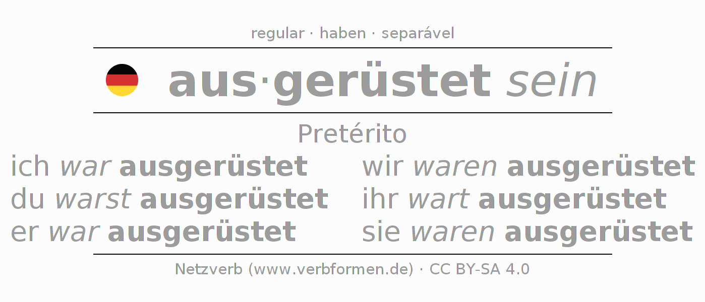 A conjugação do verbo ausrüsten no Estado passivo Pretérito Indicativo Pretérito é: ich war ausgerüstet, du warst ausgerüstet, er war ausgerüstet, wir waren ausgerüstet, ihr wart ausgerüstet, sie waren ausgerüstet.A formação dessas formas segue determinadas regras gramaticais. Os requisitos para a conjugação do verbo como forma verbal simples no ausrüsten do Pretérito. Comentários ☆