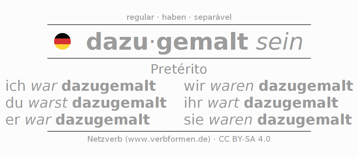 A conjugação do verbo dazumalen no Estado passivo Pretérito Indicativo Pretérito é: ich war dazugemalt, du warst dazugemalt, er war dazugemalt, wir waren dazugemalt, ihr wart dazugemalt, sie waren dazugemalt.A formação dessas formas segue determinadas regras gramaticais. Os requisitos para a conjugação do verbo como forma verbal simples no dazumalen do Pretérito. Comentários ☆