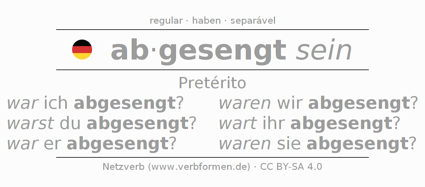 A conjugação do verbo absengen no Estado passivo Pretérito Indicativo Pretérito é: war ich abgesengt?, warst du abgesengt?, war er abgesengt?, waren wir abgesengt?, wart ihr abgesengt?, waren sie abgesengt?.A formação dessas formas segue determinadas regras gramaticais. Os requisitos para a conjugação do verbo como forma verbal simples no absengen do Pretérito. Comentários ☆