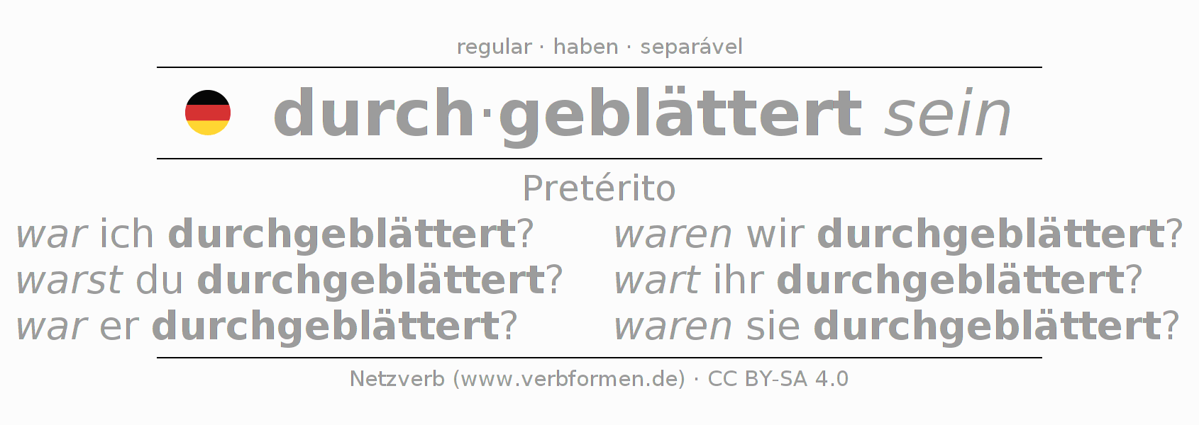 A conjugação do verbo durchblättern no Estado passivo Pretérito Indicativo Pretérito é: war ich durchgeblättert?, warst du durchgeblättert?, war er durchgeblättert?, waren wir durchgeblättert?, wart ihr durchgeblättert?, waren sie durchgeblättert?.A formação dessas formas segue determinadas regras gramaticais. Os requisitos para a conjugação do verbo como forma verbal simples no durchblättern do Pretérito. Comentários ☆