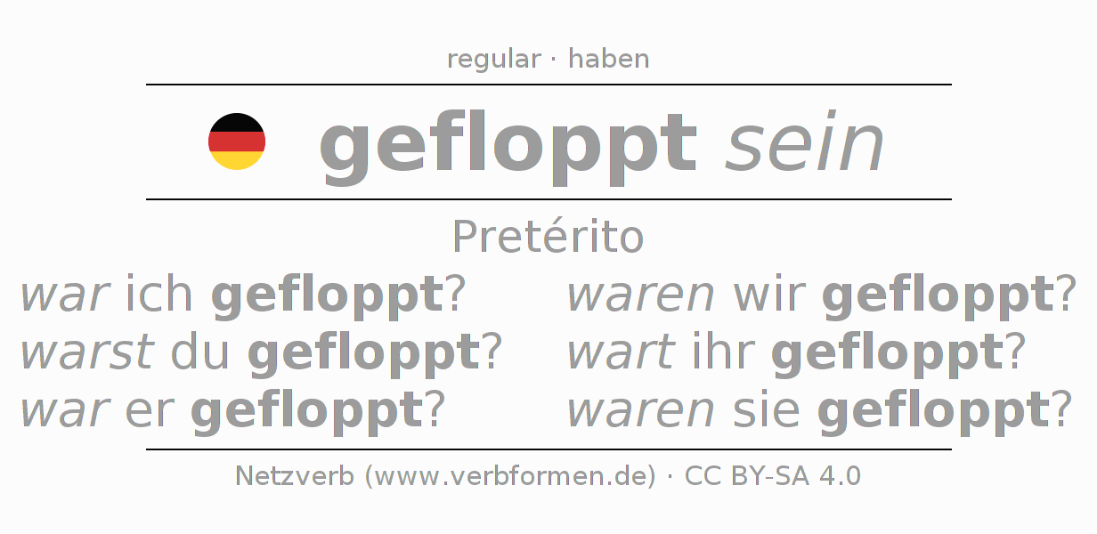 A conjugação do verbo floppen no Estado passivo Pretérito Indicativo Pretérito é: war ich gefloppt?, warst du gefloppt?, war er gefloppt?, waren wir gefloppt?, wart ihr gefloppt?, waren sie gefloppt?.A formação dessas formas segue determinadas regras gramaticais. Os requisitos para a conjugação do verbo como forma verbal simples no floppen do Pretérito. Comentários ☆