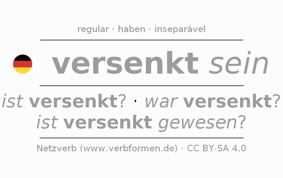 A conjugação do verbo versenken no Estado passivo Pretérito Indicativo Pretérito é: war ich versenkt?, warst du versenkt?, war er versenkt?, waren wir versenkt?, wart ihr versenkt?, waren sie versenkt?.A formação dessas formas segue determinadas regras gramaticais. Os requisitos para a conjugação do verbo como forma verbal simples no versenken do Pretérito. Comentários ☆