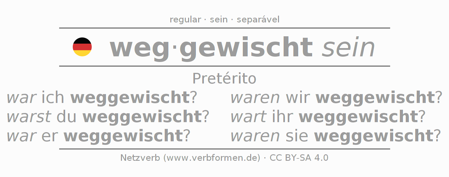 A conjugação do verbo wegwischen no Estado passivo Pretérito Indicativo Pretérito é: war ich weggewischt?, warst du weggewischt?, war er weggewischt?, waren wir weggewischt?, wart ihr weggewischt?, waren sie weggewischt?.A formação dessas formas segue determinadas regras gramaticais. Os requisitos para a conjugação do verbo como forma verbal simples no wegwischen do Pretérito. Comentários ☆