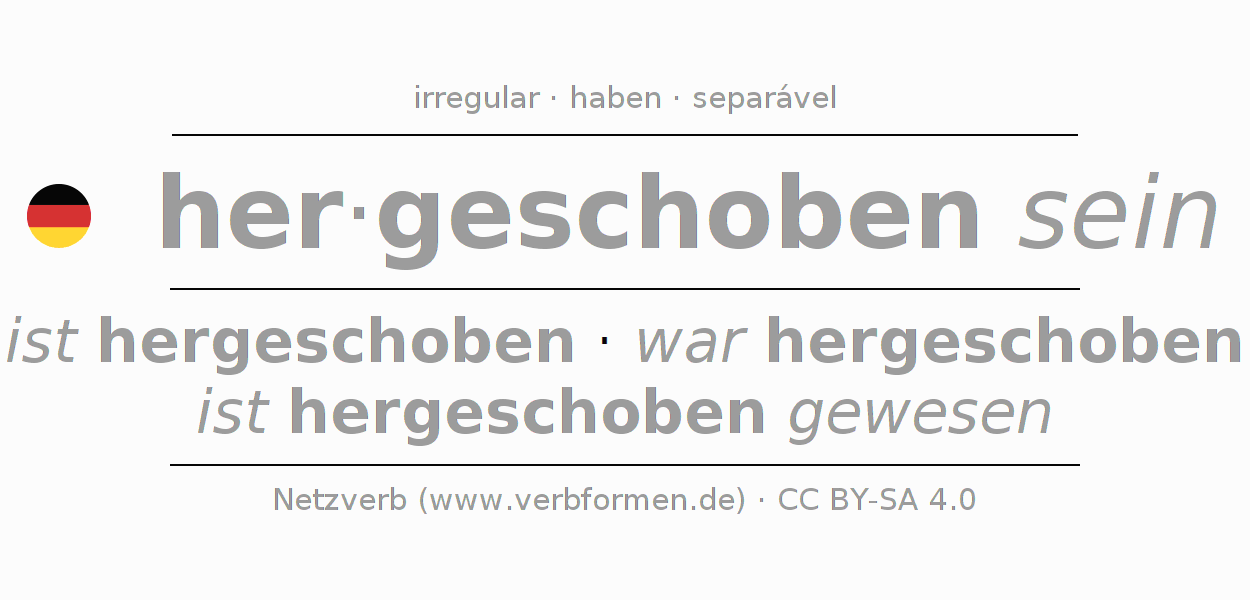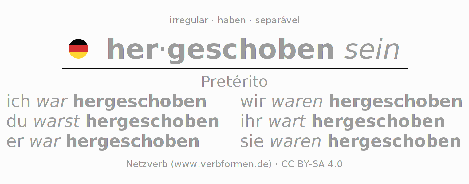 A conjugação do verbo herschieben no Estado passivo Pretérito Indicativo Pretérito é: ich war hergeschoben, du warst hergeschoben, er war hergeschoben, wir waren hergeschoben, ihr wart hergeschoben, sie waren hergeschoben.A formação dessas formas segue determinadas regras gramaticais. Os requisitos para a conjugação do verbo como forma verbal simples no herschieben do Pretérito. Comentários ☆