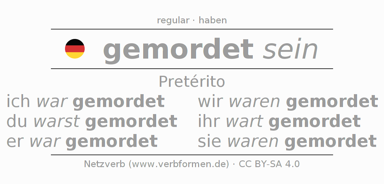 A conjugação do verbo morden no Estado passivo Pretérito Indicativo Pretérito é: ich war gemordet, du warst gemordet, er war gemordet, wir waren gemordet, ihr wart gemordet, sie waren gemordet.A formação dessas formas segue determinadas regras gramaticais. Os requisitos para a conjugação do verbo como forma verbal simples no morden do Pretérito. Comentários ☆